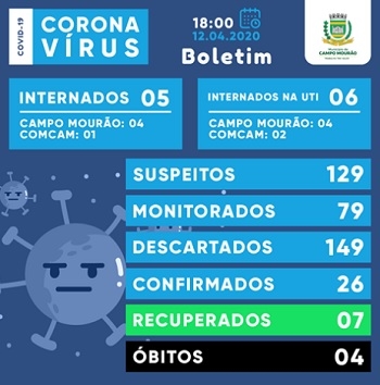 O Boletim do Covid-19 divulgado pela prefeitura de Campo Mourão neste domingo de Páscoa foi o melhor (ou menos ruim) dos últimos dias. O número de casos confirmados (26) e de óbitos (4) se manteve o mesmo do dia anterior. Os casos em monitoramente diminuíram de 81 para 79 e os suspeitos de 132 para 129. Diminuíram também (de sete para seis) os casos usando UTI. O que aumentou foi o número de pacientes recuperados, de seis para sete.