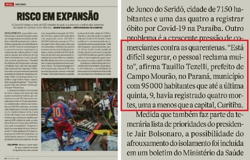 O alto índice de casos (e mortes) de Covid-19 em Campo Mourão fez com que o prefeito Tauillo Tezelli fosse citado na revista Veja desta semana. Na reportagem "Risco em expansão", ele fala da pressão de comerciantes pelo fim da quarentena. "Está difícil segurar, o pessoal reclama muito", disse à revista famosa.