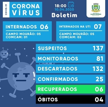 Subiu de 24 para 25 o número de casos confirmados de Covid-19 em Campo Mourão. É o que mostra o boletim divulgado pela prefeitura nesta sexta-feira (18h30). Os suspeitos foram de 120 para 137. Na UTI estão sete pacientes (dois da região). Os números de recuperados (6) e de mortos (4) são os mesmos de quinta-feira.