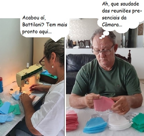 Os cliques são da página no Facebook do vereador Edson Battilani, de Campo Mourão. Nesse período de quarentena e isolamento social, mostrou que, enquanto a esposa, a professora Izabel, confecciona máscaras de proteção, ele atua como "auxiliar de produção".