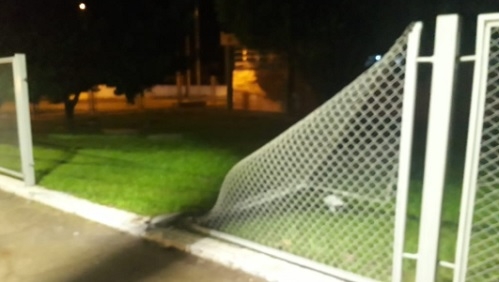 "Na Ciretran de Campo Mourão cai. Na madrugada de domingo, mais um carro desgovernado invadiu o órgão e derrubou parte da grade. O motorista fugiu, deixando o prejuízo ao patrimônio público".