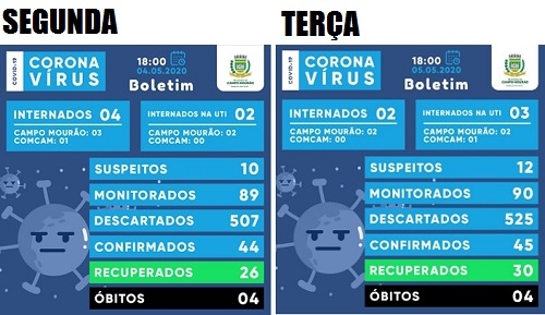 Campo Mourão confirmou nesta terça-feira, o 45º caso de Covid-19. Desse total, 30 já estão recuperados, dois estão na UTI, dois na enfermaria, quatro morreram e sete se tratam em casa. O boletim desta terça-feira mostra mais um paciente da região na UTI. Trata-se de morador de Goioerê, que já teve coronavírus confirmado. É o quinto caso da cidade.
