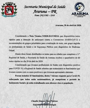 A Secretaria de Saúde de Araruna divulgou nota sobre os sete novos casos de coronvaírus na cidade. Pudera. Foi um aumento de quase 60%, elevando os casos de 12 para 19. Segundo o texto, 43 funcionários da Saúde, que tiveram contato com positivados, fizeram o teste e sete deram positivo. Todos já estão recuperados. "Cumpriram o período de isolamento social e já estão trabalhando sem oferecer risco à população", destaca a nota.