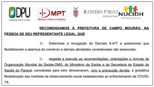 O Ministério Público e a Defensoria Pública querem que Campo Mourão revogue o decreto que permitiu a reabertura do comércio.