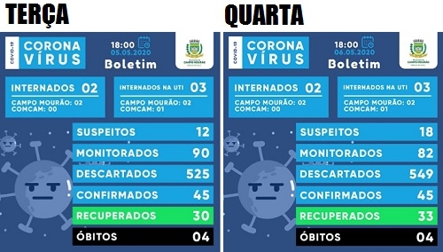 Quarta-feira positiva no boletim do Covid-19 em Campo Mourão. Não houve novos casos confirmados, não houve mais ninguém internado (nem UTI, nem na enfermaria) e, melhor, sem novas mortes. Além disso, houve mais três pacientes recuperados. Agora são 33. De ruim, só que o número de suspeitos subiu de 12 para 18.