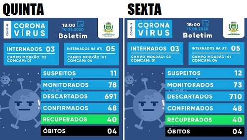 Boletim do covid-19 desta sexta-feira mostra Campo Mourão sem novos casos pelo terceiro dia seguido. Seguem 48 confirmações, com 40 recuperados. Aumento só no número de suspeitos, de 11 para 12. O número de pacientes internados não mudou - três na enfermaria e cinco na UTI (um de Campo Mourão e quatro da região).