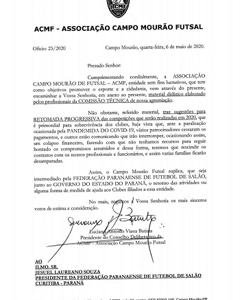 A diretoria da ACMF enviou oficío à Federação Paranaense de Futsal sugerindo a volta progressiva das competições.