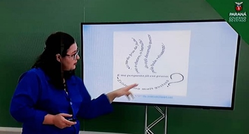 A cena é uma reprodução de uma aula de língua portuguesa (6ª série) no canal Aula Paraná, criado para a rede pública em tempos de coronavírus. A professora fala sobre poesia concreta. Na tela, o poema "Xícara", que é do professor Fábio Sexugi, de Peabiru. A poesia dele foi incluído no livro didático "Tecendo linguagens". Sexugi é vereador e preside a Academia Mourãoense de Letras. "Muito feliz", postou ele no Facebook.