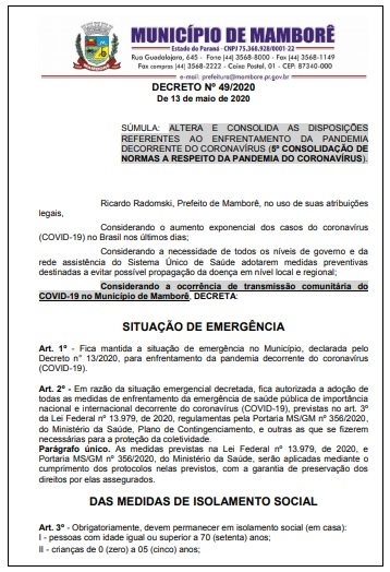 Decreto do prefeito Ricardo Radomski voltou com restrições a igrejas e restaurantes de Mamborê.