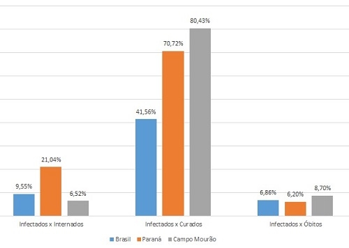 Gráfico compara Campo Mourão com o Paraná e o Brasil com relação ao coronavírus.