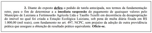 A prefeitura de Luiziana terá de parar de pagar as mensalidades pela área onde foi criada a Estação Ecológica.