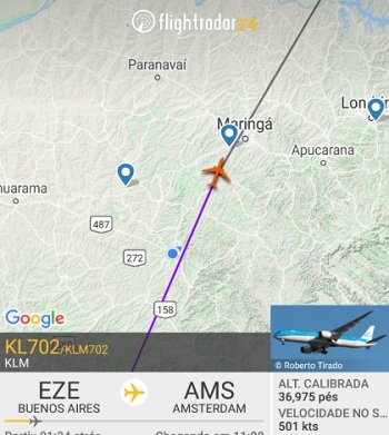 Campo Mourão fica na rota de parte dos voos entre Buenos Aires (Argentina) e a Europa. Em tempos de coronavírus, no entanto, o "tráfego aéreo mourãoense" deu uma acalmada. As aeronaves sumiram dos céus. Neste sábado, no entanto, passou sobre a cidade um avião que seguia para Amsterdam, como registrou o site Flightradar. Ah, acabou o sossego...