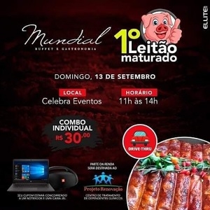 Que tal almoçar domingo o prato típico de Goioerê? Pois fique sabendo que restam os últimos 100 convites do 1.o Leitão Maturado Drive Thru, promovido pelo buffet Mundial, em Campo Mourão. O combo custa a R$ 30 e parte da renda vai para o Projeto Renovação, que trata de dependentes químicos. A retirada será no Celebra, das 11h às 14h.