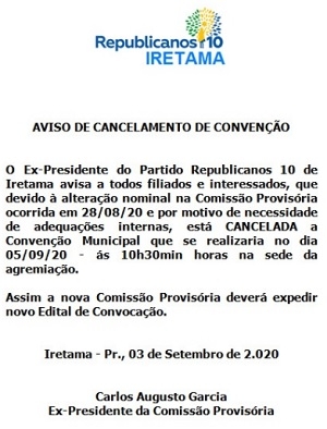 O Republicanos de Iretama tinha marcado convenção para este sábado.