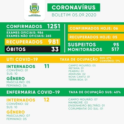 Boletim Covid deste sábado mostra mais seis casos confirmados em Campo Mourão. O total desde o inicio da pandemia foi a 1.251. Houve seis recuperados e o total foi a 981. Os óbitos são 33. Assim, ficou mantido em 237 os mourãoenses com o vírus ativo.