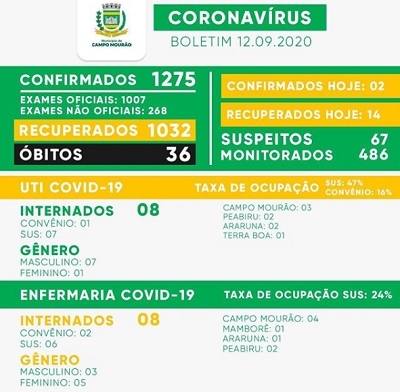 O boletim covid deste sábado mostra mais dois casos confirmados em Campo Mourão. O total foi a 1.275. O número de recuperados, no entanto, foi bem maior: 14 (total de 1.032). São 207 os mourãoenses com o vírus ativo, o número em muito tempo.