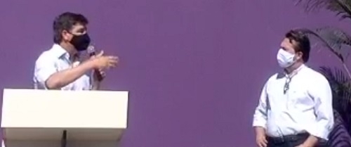 Valter Peres, prefeito de Terra Boa, enchendo a bola do secretário de Estado Márcio Nunes, durante discurso na inauguração da nova capela mortuária da cidade; sábado.