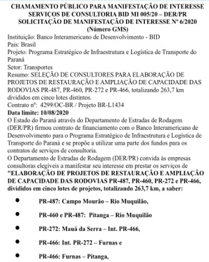 O DER abriu chamamento público para empresas interessadas em fazer estudos para restauração e ampliação da capacidade da BR-487 entre Campo Mourão e o rio Muquilão (Iretama). Também estão incluídos trechos da 487 e da PR-460 entre o Muquilão e Pitanga. Consultores interessados devem ser manifestar até o próximo dia 10. O serviço será pago através de contrato firmado com o BID.