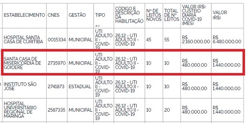No caso goioerense, com 10 leitos, são R$ 480 mil mensais (R$ 1,44 milhão para os 90 dias).
