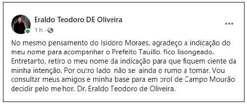 Eraldo frisou que consultará amigos e a base para decidir "em prol de Campo Mourão".