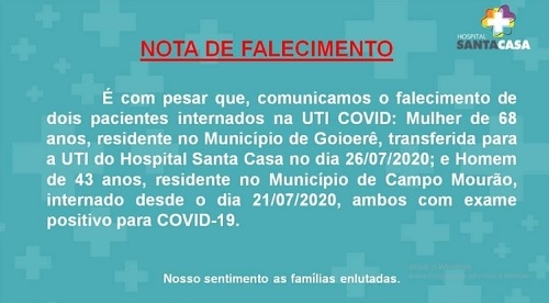 Campo Mourão confirmou mais uma morte por covid nesta quarta-feira. Foi um homem de 43 anos, o 14° óbito da cidade. Morreu também moradora de Janiópolis, de 68 anos, a quarta morte do município. Na região toda já são 49 óbitos por coronavírus desde o início da pandemia.