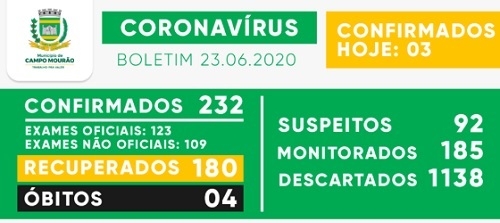 O número de novos casos de covid confirmados nesta terça-feira em Campo Mourão até que foi pouco: três. Foram de 229 para 232. Houve dois recuperados e agora são 180. O que aumentou bastante foram os casos suspeitos: 21 em 24 horas, saltando de 71 para 92.