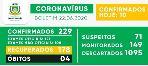 A segunda-feira teve mais 10 casos de coronavírus confirmados em Campo Mourão - nove por exames oficiais e um por não-oficial. O total foi para 229. Os casos suspeitos subiram de 58 para 71. Os pacientes recuperados foram de 170 para 178.
