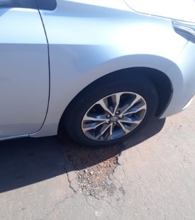 "Morador de Goioerê quebra roda do carro em buraco na av. Daniel Portela, em frente à igreja matriz, no centro da cidade. Disse que vai acionar a prefeitura".
