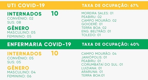 A enfermaria covid também está com 10 leitos ocupados (40%).