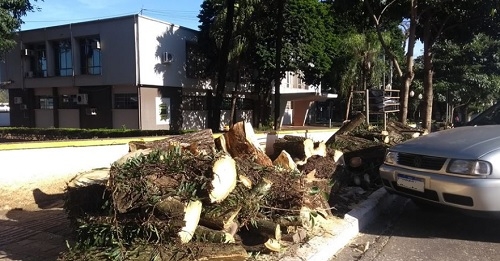 Teve quadra da rua Brasil interditada e tudo nesta quarta-feira em Campo Mourão. Motivo? Corte de árvores em frente à prefeitura. Três foram, como diria a dona Armênia da novela, "pra chón".