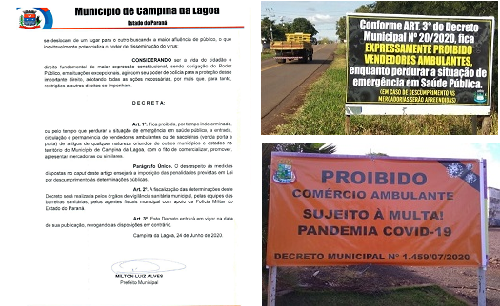 Em época de coronavírus não está fácil para ninguém. Várias cidades da região proibiram a entrada de vendedores ambulantes. Em Campina da Lagoa a probição está em decreto assinado nesta quarta-feira pelo prefeito Milton Luiz Alves. Em Altamira do Paraná (foto de cima) e em Rancho Alegre do Oeste (foto de baixo) placas nas entradas das cidades dão o recado ao ambulantes que ousarem chegar por lá.