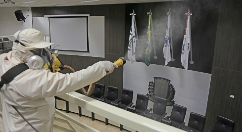 Quinta-feira foi dia de desinfecção na Câmara de Campo Mourão. O legislativo está fechado desde o início da semana, depois que uma assessora testou positivo para a covid-19. O desinfetante foi aplicado no plenário, nas salas de reuniões, gabinetes, corredores, garagem e nos acessos internos e externos do prédio. Todos os servidores e vereadores irão fazer exames. Os testes começam nesta sexta-feira (8h), no Centro da Juventude.