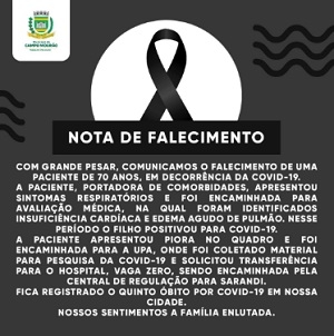 A Secretaria de Saúde informou nesta terça-feira a quinta morte de paciente de Campo Mourão com covid-19.