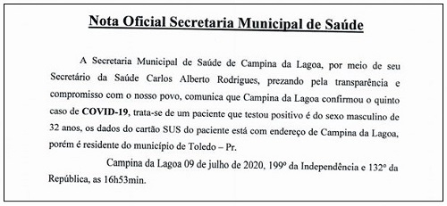 A prefeitura de Campina da Lagoa incluiu um quinto caso de coronavírus no municipio no boletim da Secretaria Municipal de Saúde. O secretário Carlos Alberto Rodrigues, no entanto, assinou "Nota oficial" para deixar claro que, apesar de usar Cartão SUS de Campina da Lagoa, o paciente atualmente mora em Toledo.