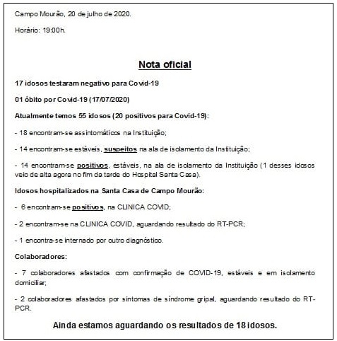 ...são os internos do Lar dos Velhinhos Frederico Ozanan, de Campo Mourão, que testaram positivo para a covid-19. Sete estão internados na Santa Casa. Todos os 55 idosos da instituição foram submetidos a exames depois do primeiro caso confirmado. Um interno morreu na sexta-feira por causa do coronavírus. Entre os funcionários do lar, um testou positivo para o vírus.