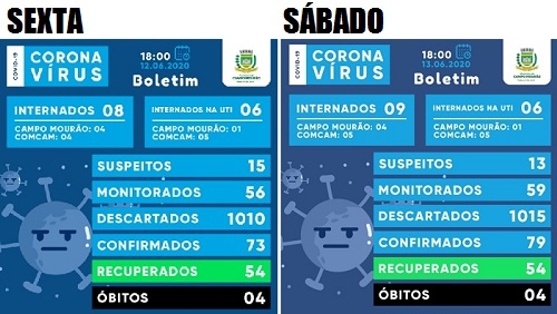 Mais seis casos de coronavírus foram confirmados neste sábado em Campo Mourão. O total foi a 79. Somente em junho já são 26, ou seja, dois por dia na média. Em maio a média diária foi inferior a meio caso. De positivo no boletim deste sábado estão as intermações. Seguiram as mesmas seis na UTI (só um paciente de Campo Mourão) e na enfermaria foi de oito para nove, mas sem aumento de mourãoenses.