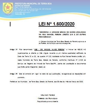 A Câmara aprovou e o prefeito Valter Peres sancionou a lei que muda o nome do "postão" de saúde de Terra Boa.