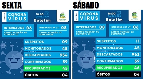 Nenhum caso de covid-19 foi confirmado neste sábado em Campo Mourão, Seguem 59. Melhor: houve mais um paciente recuperado (agora são 46). Outra notícia boa: os leitos ocupados na UTI caíram de oito para seis - dois de Campo Mourão e quatro da região. Na enfermaria, subiram de seis para oito. Os casos suspeitos foram de nove para 11.