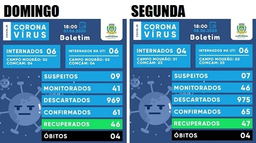O boletim desta segunda-feira mostra redução nas internações na enfermaria, de seis para quatro (só um paciente de Campo Mourão). A UTI manteve seis leitos ocupados, com três mourãoenses).