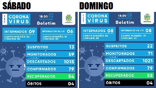 Ufa! Domingo sem novos casos de coronavírus em Campo Mourão. Seguem os 79. O que aumentou foram os casos suspeitos, de 13 para 22. Também aumentaram as internações na UTI, de seis para oito. Entraram mais dois pacientes da região (são sete da região e um de Campo Mourão). Na enfermaria diminuiu de nove para oito (três mourãoenses). Houve mais um paciente recuperado. Agora são 55.