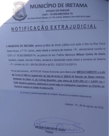 O prefeito de Iretama, Wilson Bratac, enviou notificação extrajudical para as famílias que invadiram terreno da prefeitura.