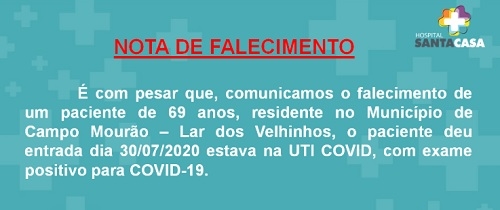 Subiu para cinco o número de mortes por coronavírus no Lar dos Velhinhos de Campo Mourão. A quinta vítima foi um homem de 69 anos que estava na UTI da Santa Casa desde o último dia 30. Agora são 16 os óbitos por covid em Campo Mourão e 54 em toda a região. O asilo tinha 56 internos quando 28 testaram positivo para a doença.