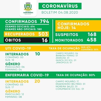 Mais 14 casos de coronavírus foram confirmados nesta terça-feira em Campo Mourão. O total foi a 794. Houve oito recuperados e eles agora são 503. E apareceram mais 28 casos suspeitos, saltando de 140 para 168. Os mourãoenses no momento com o vírus são 276.