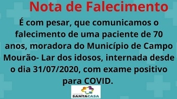 Uma mulher de 70 ano morreu de covid na noite desta quarta-feira na Santa Casa de Campo Mourão. Era interna do Lar dos Velhinhos. Foi o sétimo óbito por coronavírus na instituição, o segundo no mesmo dia. O total de mortes na cidade foi a 18 e na região a 58.