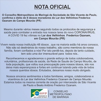 Conselho Metropolitano de Maringá da Sociedade São Vicente de Paulo, em "Nota oficial" em que confirma a morte por covid do oitavo interno do Lar dos Velhinhos de Campo Mourão; nesta quinta-feira.