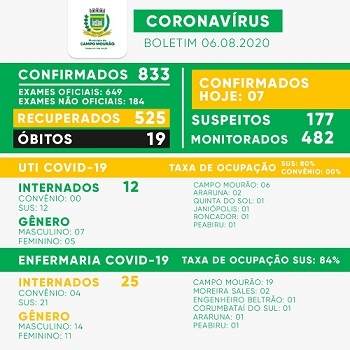 Com as sete novas confirmações, o total de casos em Campo Mourão foi a 833. O número de suspeitos aumentou bem, de 133 para 177. Não houve recuperados e os óbitos foram a 19.