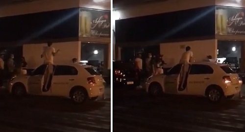 Sábado à noite, no centro de Campo Mourão. Homem sobe em carro da fiscalização da prefeitura.