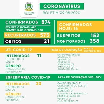 Campo Mourão registrou neste domingo mais 16 casos de coronavírus. O total foi a 874. Houve 19 recuperados e eles foram a 573. Os mourãoenses com o vírus, no momento, são 280.