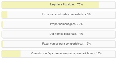 "O que um vereador deve fazer para honrar seu voto?" Enquete encerrada neste domingo não teve nem graça. Para 75% de quem votou o negócio é "legislar e fiscalizar". Só 5% foram de "fazer os pedidos da comunidade". Mas teve voto até para "propor homenagens" (2%) e "dar nome para ruas" (1%). Já para 15% "que não me faça passar vergonha já estará bom".