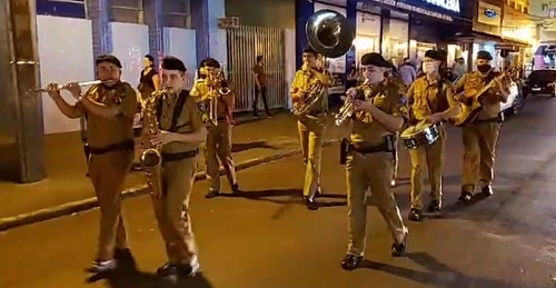 A Banda da Polícia Militar do Paraná realizou "caminhada musical" neste domingo à noite em Campo Mourão. Foi para comemorar os 166 anos da PMPR, que serão completados nesta segunda-feira. Os policiais-músicos saíram da praça São José e percorreram algumas quadras da av. Capitão Índio Bandeira. Antes, se apresentaram na Santa Casa. Tudo transmitido ao vivo por redes sociais.